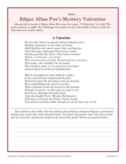 Valentine's Day Worksheet | Poe: A Valentine | High School from www.k12reader.com Regarded in literary histories and. Edgar allan poe was an american writer, poet, critic and editor best known for evocative short stories and poems that captured the imagination and interest of readers around the world. For her this rhyme is penned, whose luminous eyes, brightly expressive as the twins of loeda, shall find her own sweet name, that, nestling lies.